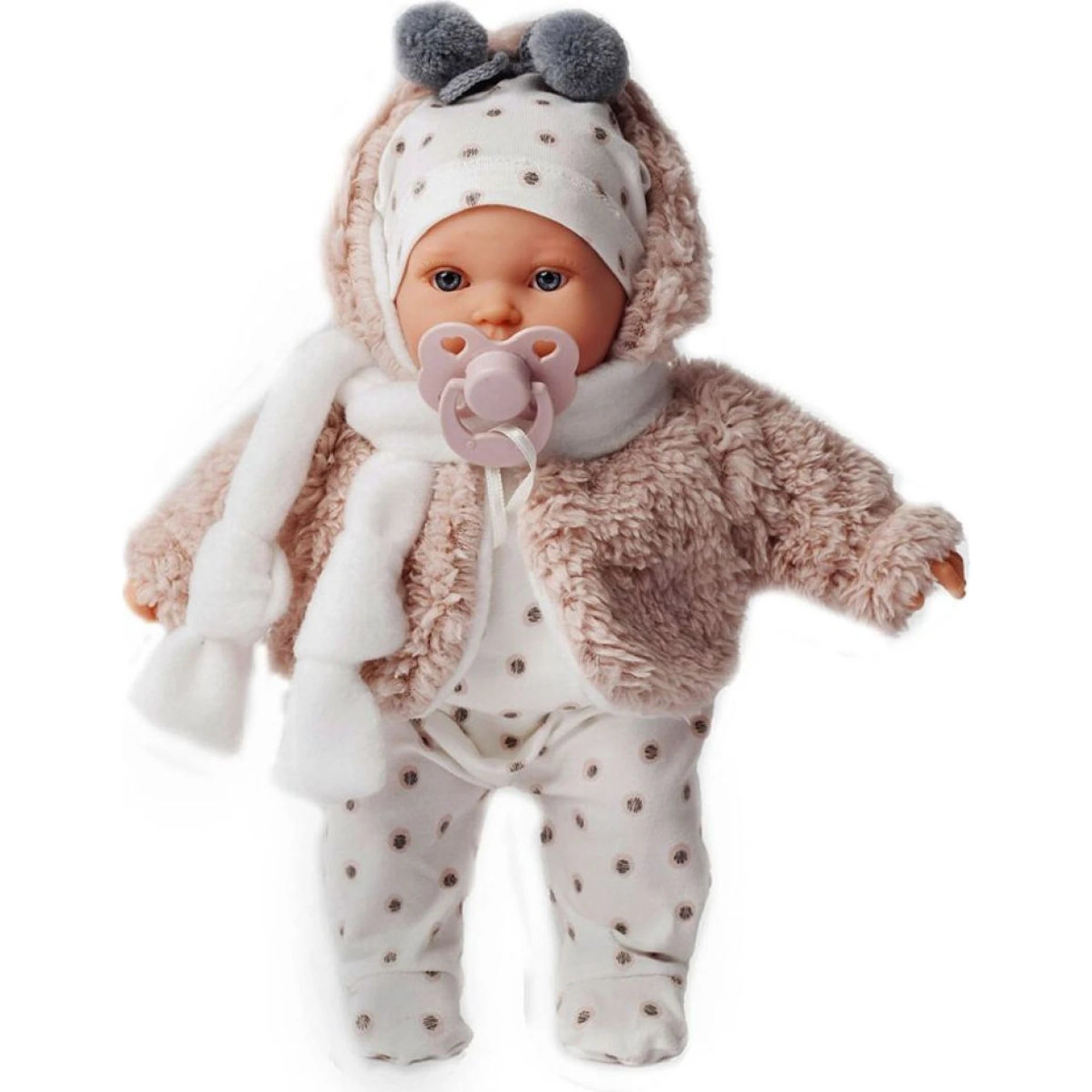 Die Figur hat einen weichen Stoffkörper, Kopf und Gliedmaßen sind aus Vinyl. Das Outfit besteht aus einem Material, das sich angenehm anfühlt. Diesmal trägt sie helle Strampler mit feinem Muster und einen flauschigen Mantel mit Schal. Auf dem Kopf sitzt eine Mütze mit Bommelchen.
