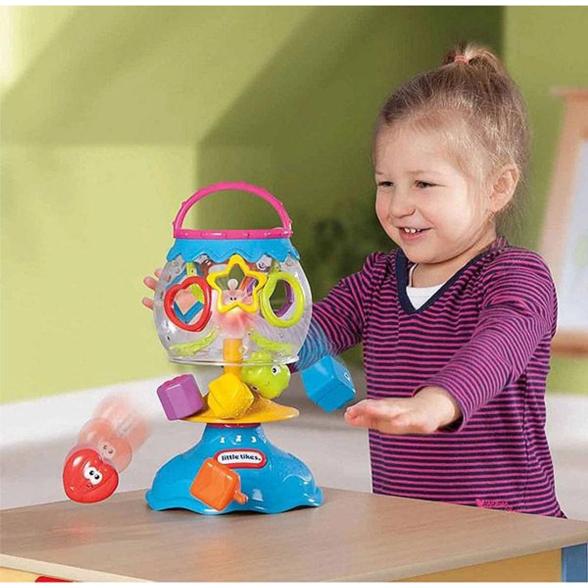 Hat der Oktopus in seinem transparenten Kopf bunte Teile gesammelt und drücken Kinder den Knopf, dann leuchtet der Kopf auf und beginnt auf Englisch zu sprechen. Danach gibt er die drehenden Würfel frei. Die Kinder können sie auffangen und zurück in den Oktopus stecken.
