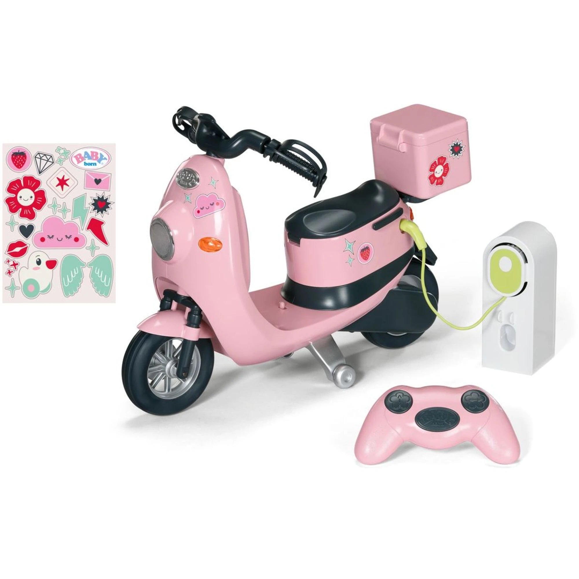 Sobald die Puppe auf dem breiten Sitz Platz genommen hat und ihre Händchen am Lenker gesichert sind, lässt sich der Roller per Fernbedienung steuern. Die Puppe ist nicht im Artikel enthalten.
