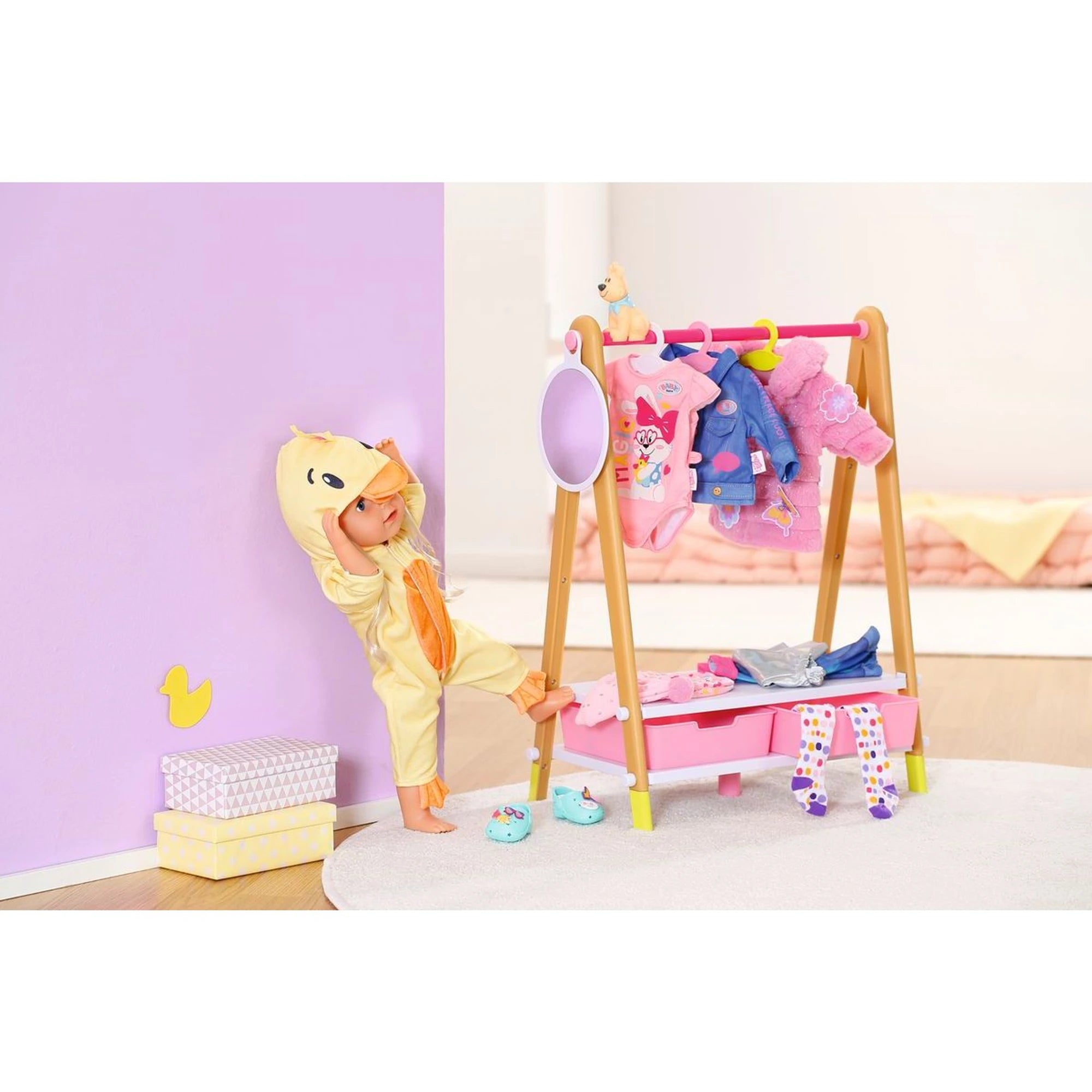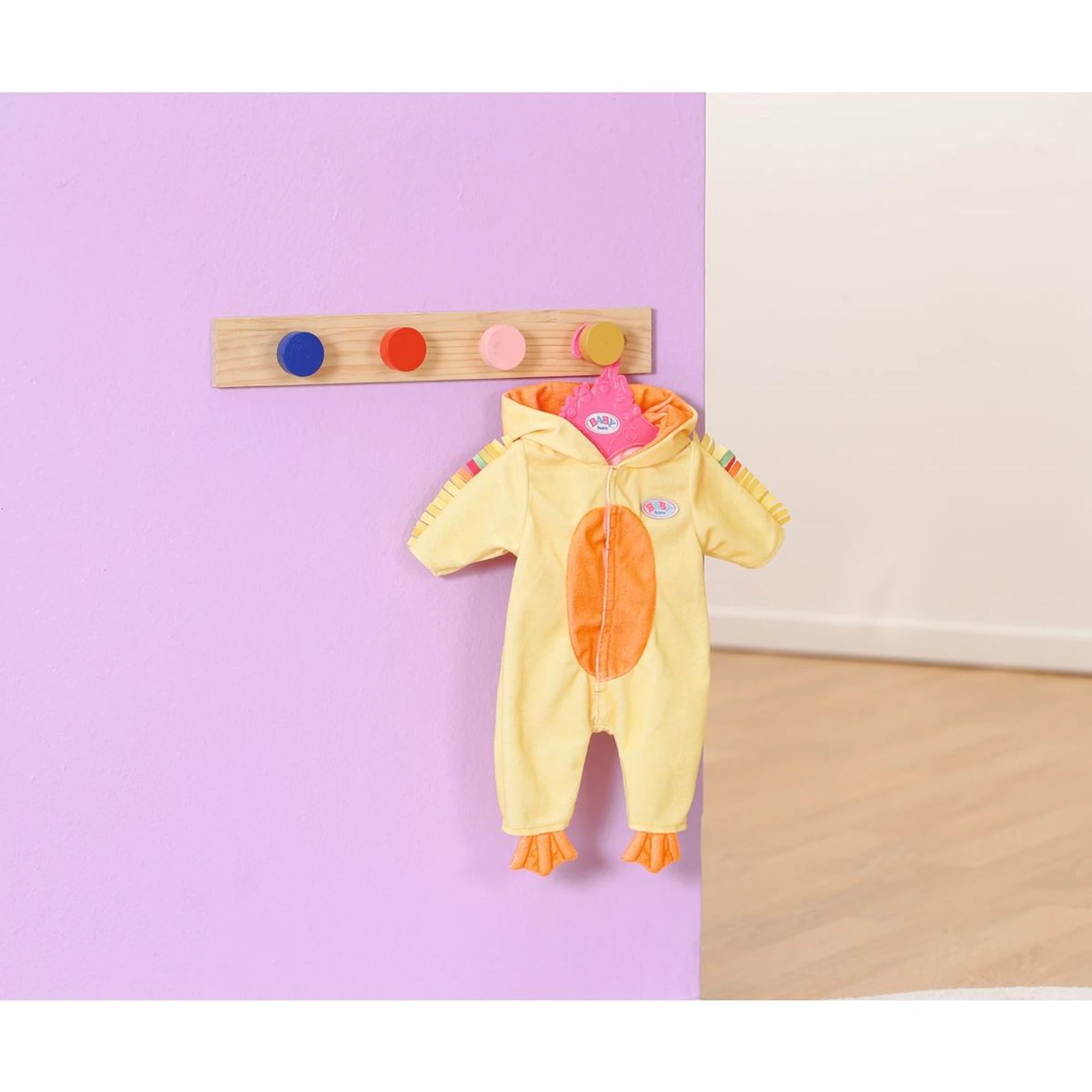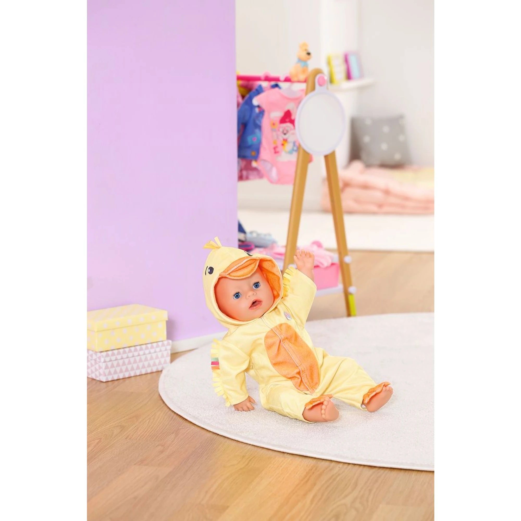 Originelles Kostüm des Entchens Berta für Baby Born Puppen – als einteiliger Overall mit Kapuze – ist für Puppen in der Größe 43 cm gedacht.