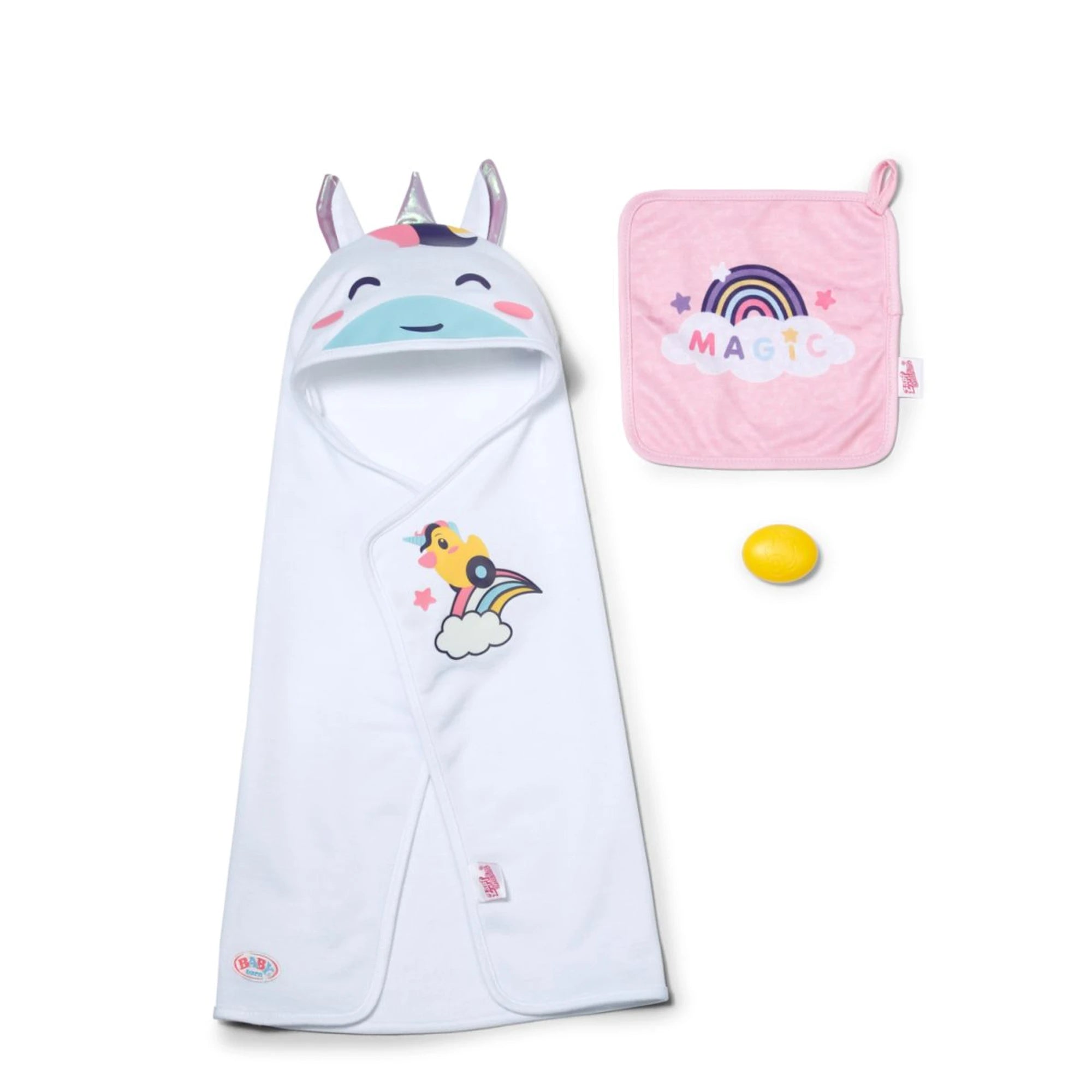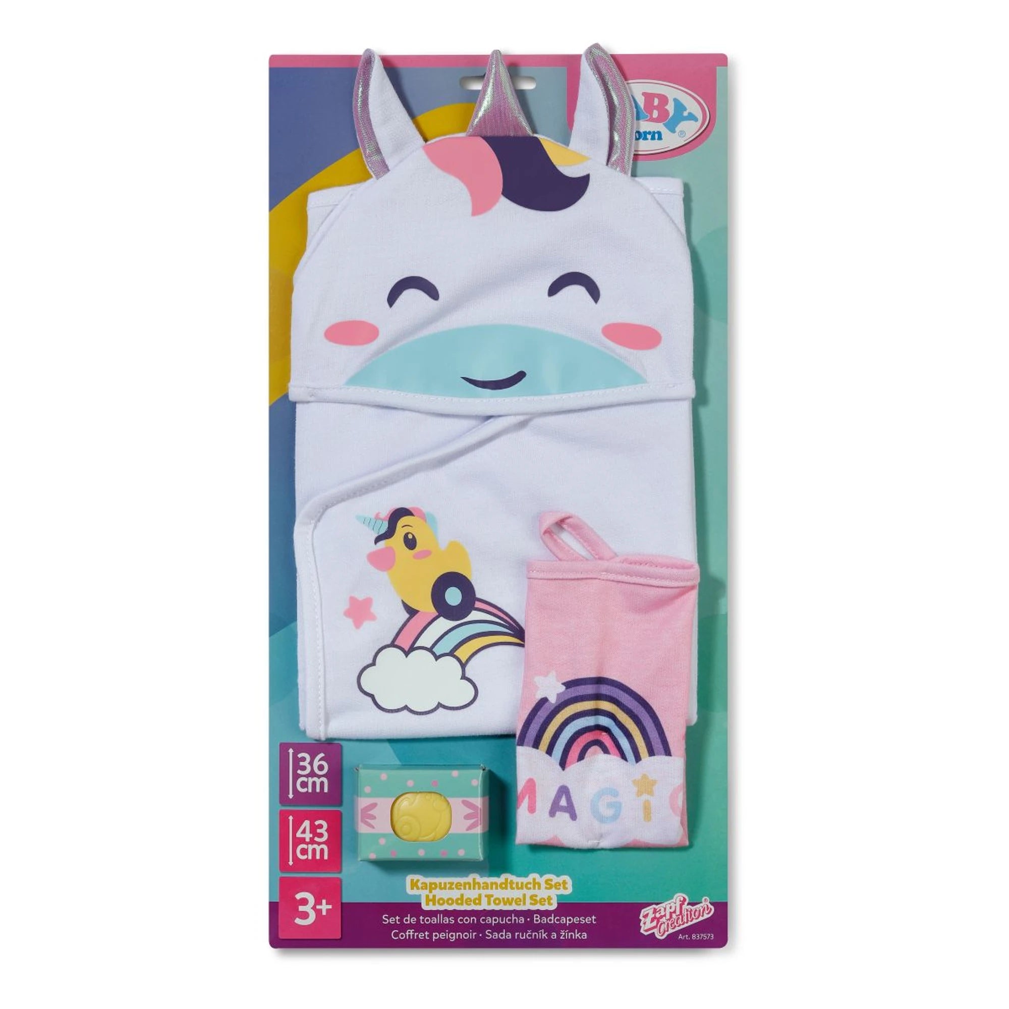 Das Zapf BABY born Handtuch-Set bringt ins Puppenbad gleich zwei Dinge: kuschelige Sanftheit und eine Portion Spaß. Ein weißes Handtuch mit Einhorn auf der Kapuze – mit Öhrchen und Horn – und dazu ein kleines rosa Handtuch mit Regenbogen machen aus jedem Abtrocknen einen richtig hübschen Moment. Die Handtücher sind weich und angenehm im Griff, passend für Puppen in den Größen 36 cm und 43 cm. So wird das Spiel nach jedem Baden schön bunt und herrlich gemütlich.